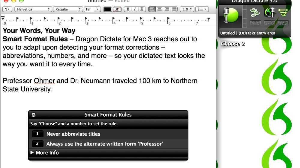 In Windows, Nuance has used some clever tricks to overcome this problem in the most important programs, like Word and Outlook. On the Mac, however, the program has no idea what you've done manually, by clicking. So you can say something like "select fishmonger," and the program correctly selects that word. But if you then say "italicize that" or "capitalize that," the program operates on the wrong words, italicizing or capping something a mile away from the selection. Bizarre.